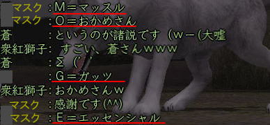 ![]() コンピラポポロン♪ ・・・紅子です。 うっすら見えるエッフェルが素敵でしょ。 へそたちの狩りに乗り遅れた紅子は のんびり川越で生産モード。 ・・・・でしたが、お花から対話が入り、 当然「なんかして」遊ぶことに。w この場合の「なんかする」は、 もう修得・経験無視無視の ただのお遊びが多いのですが、 花「マスクも暇してるっぽw」 ほぉ〜・・・ マスクがヌンジャでくれば 忍・薬・鍛 で針毛犬いくのも悪くないw お遊びよりも、本気経験・修得を考えるあたりが 最近大人になってきた紅子さん。 てか、針だったら遊びながらでも ガッチリ経験つめるもんね♪ で、マスクを稲葉から呼び寄せる。 ![]() 歌丸さんだぁ〜( ^▽^)ノノ ・・・・って ノってる場合じゃないw 相変わらずアフォなやつwww ![]() 何はともあれ針犬開始♪ ![]() ちょっと遅れてお花の友達蒼ニンジャーさんも参戦。 ![]() みよ、紅子の三連撃! ![]() たまには、決めるのよw フフ、頭のエッフェルが誇らしく見えるわw ・・・・とそんなとき ![]() ![]() タッタカター タッタカター ![]() ![]() ・・・・・・・・・・・・・。 ![]() そう、気合の神様、もげ神主の登場さぁ〜! おぃちゃん、紅子たちに気合をおくれよぉ〜〜!! ![]() いあ、なんかさ〜キツネでてくると、「もげー」って言う人いるじゃない?w だから何の考えもなしに「もげもげ」言ってたわけでw すると、蒼ニンジャー。 もっさり。。。。www 負けじと マスクが・・・・・・ ![]() マッスルおかめがガッツで エッセンシャルですよー!w そして、 お花の顔がもげになる事件が発生。 ![]() 「ちゃら〜〜ん もっさりおかめのお花薬師ですw」 ![]() で、あなた誰???ww マスクが変身を始めると・・・・ ![]() もう、誰が誰だかわかりませんからー!w ![]() もう、当然のごとく・・・・ ![]() 普通の針犬狩りのセオリーなんか全く無視なわけで。。。 かくし芸大会の勃発。 ![]() 発雷じゃぁ! ![]() 雷撃じゃぁ! ![]() 分(-(-_(-_(-_-)_-)_-)-)身じゃあ!! ![]() ・・・・・・分身攻撃って・・・・ ライダーキックとかみたいで なんだか安直なネーミングだわ(’’ ぶんし〜〜ん、あた〜〜っく! みたいな。 ![]() そしてお花がレベルアップしたところで もげもげっと終了〜♪ ![]() みんなありがと^^ また遊ぼうねぇ〜い♪♪ ちなみに・・・・ 本日の徒党会話にて。 ![]() =( ̄□ ̄;)⇒ ずがーん! マスク、いつかコロス。 手槍でね^^ |
