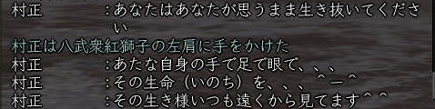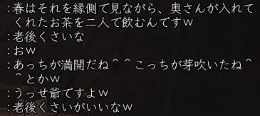 ![]() 紅の鍛冶屋の先輩、村正。 生産の話し、ソロの話し、修得の話し・・・ いろんなことをいつも対話でアドバイスくれた よきお友達です。 えと、なぜ薬師なのかとゆうと、 ホントの引退の時に紅がどうしても行けなかったため キャラデリしてしまった本来の村正の生き写しで わざわざ キャラ作ってくれたからなのねw 作るなら 鍛冶屋ツクレヨwww 引退は引退なのですが、 リアルで弟さんがアカ使うらしいので 本人もお気に入りの 巫女常盤ちゃんのお屋敷だけは残すとのこと。 早速常盤ちゃんのお屋敷 (兼 村正のうち)へお宅訪問に参ります・・・ ![]() (`ロ´;) ![]() こわいよ!!! ・・・・・と、いいつつ、 ![]() 当然 こうなります。 ![]() ・・・・・と、そこに、 ![]() うっとりが無言でやってきて ![]() 無言で木に埋まります。 カオが増えていく 村正家の人面木・・・・ 村正自慢の緑の庭も 併せてお楽しみくださいw そんな村正のお宅訪問。 鴨居の使い方がとても上手で、 小さな屋敷が、正方形にたくさんの小部屋にわかれています。 コンセプトは、 「小さくて暖かいお家♪」 ![]() 入り口を入るとすぐに お琴でお出迎えw 薬師の大乗衣姿でお琴がとても似合ってるのぉ^^ か、かじやのハッピでは・・・ww ![]() ここがキッチン。 設備も整っていて、おいしいご飯が炊けそうです^^ ![]() 食事をごちそうになりながら、 狩りの武勇伝、夢、未来の壮大な話に 時を忘れ、語り明かしましょう。 ステキダワァ*:.。..。.:*・゚(n‘∀‘)η゚・*:.。..。.:* ミ ☆ 注)この時の会話の内容は、「楽天イーグルス談義」でした。w ![]() ここが、鍛冶屋村正の仕事場。 壁にぶっそうなモノがかけてあるのでご用心! いろんな家具・道具があって 本格的ね^^ ![]() そしてこれが 今思えば村正の遺品。 w−の十字槍ができたときに、紅がプレゼントしてもらったものですm(_ _"m) 最近は 槍素養もふったので、 ボス戦には欠かせない代物になってきました。 生命の付与石、本気だしとけばヨカタ(´;ェ;`) ![]() これは見事!としかいいようのない、 掘っ立て小屋が屋敷の中にせり出しつつ、 立派な岩風呂を実現した、 五右衛門風呂。 狩りや仕事のあとの ひとっぷろはたまりませんなw えっと・・・ ここで、うっとりギャグを一発。 ![]() はい、じゃんがじゃんがじゃんがじゃ〜ん♪ 村正から、当てのない突っ込みが入ります。。。。。 ![]() ![]() 満更でもなさそう。(’’ ![]() 寝室と、小部屋。 ![]() 天狗ハケーン!! 銅銭と交換できるやつらしい^^ ![]() 鼻たけぇ〜!!! こりゃ ヨン様もびっくり差!!! ![]() 日当たりのいい縁側に腰かけると、 どっちが縁側に埋まることができるかと競争しているあたしたちを尻目に、 村正の 未来予想図Uが語られはじめたのです。 ![]() ![]() 突っ込みながらも、村正らしい考え方に賛同するうっとりと紅。 (*’ー’)(,,*)(*‘∇‘)(,,*)ウンウン そして、最後に ![]() ![]() 熱いメッセージを残して ![]() 古くからの知人、村正が ![]() 引退したのでした・・・・・。 鍛冶屋の先輩、村正に たくさんの感謝をこめて。 ![]() 村正、いろいろと ありがとでした^^ ・・・・・って、薬師にお辞儀してると やっぱピンとこねぇ〜www いぁ、まじで感謝よ^−^ リアルいろいろ頑張ってくださいませ♪ |