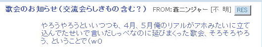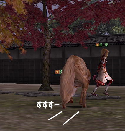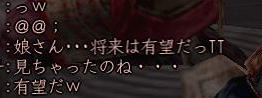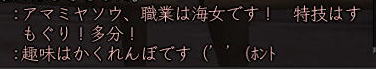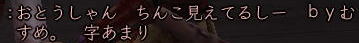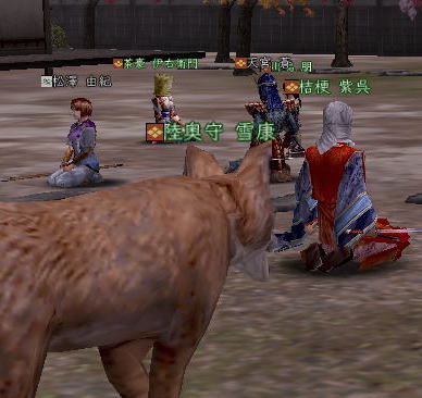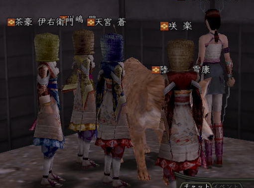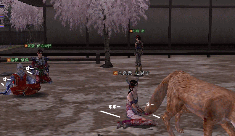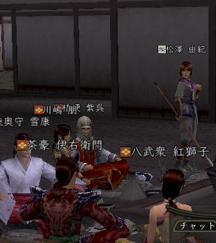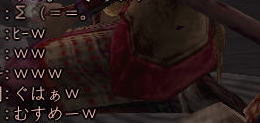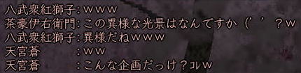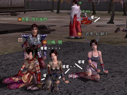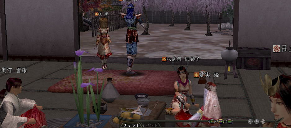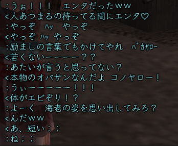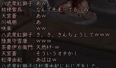 | そして、 時はぁめぇぐり〜 また夏がぁ来て〜♪ (この歌 知ってる人、かなりの仙台通か、おっさんw) 6月末、みんなが 東西戦やらホーカイワッショイやらで 東奔西走していたそんな折、 ![]() この方から、HPへのありがたいカキコをいただいたのです。 ![]() おぉぉ〜! 歌会きたぁ〜!!! カキコがあったのは6月末。 その後、ちょこっと打ち合わせをすると、 どうやら土曜の週末がいいかな、ということになり、 X-DAYは7月16日(土) 22:00〜 山賊町の蒼ニンジャー屋敷にて ということが決定。 ちゃんとしたイベントっぽいのをやるのは初めてだったので、 ちょっとドキドキわくわくだったじぇ。w ![]() そして、16日当日。 最近手にいれた、部隊アイテム「山県鎧」を身にまとい、 常盤ちゃんにもらった「獅子王の剣」で 何気におしゃれ装備を開始。 コレ、山県鎧ですよ!!! 決して 普通のダイキンパコじゃありませんからぁー!!ww 襟がついてるのが、特徴なのさ。 (女鍛冶だとわかりづら;; ![]() リアルだと、待ち合わせに 5分、10分遅れて当たり前の紅子ですが、 この日ばかりは 10分前から 待ち合わせ場所である 山賊町の屋敷管理人前で 正座して待つ 山県鎧の人。 あぁ、リアルもこうなるように ガンガロー・・・・・ ![]() さて、一番のりのお初の日立さんをはじめ、 蒼くん、姫とゾクゾク到着。 むふふ。 姫、いきなり桜欄刀ですか、気合を感じます♪ ![]() この時、甲府に 出没しはじめた A4なみなさん。 紅「あと、4人向かってる模様!」 蒼「おk^^」 紅「先に中入ってていいお^^」 というわけで、先に姫たちを中にお入れして みんなを待つことしばし・・・・・ 16日は土曜日。 土曜日といえば「エンタの神様」。 エンタといえば、22時〜 (・−・)・・・ん? 22時!!!!! 奇しくも 待ち合わせ時間をエンタ開始時間に設定してしまった 自分のコンチクショー ![]() まぁ、いい差w 結局お花と 対話でマジャ談義してましたからぁー!! ![]() 途中(おそらく)HPを見てかけつけてくれた くの一さんが通りかかるも、 これからTD行くとのこと。 終わったら 参加してくれることをお約束 (^_-)db(-_^) ![]() さて、そろそろ蒼くん家に入るか〜と、 インしてみると・・・ うぉ、イキナリ 大砲がある!! すげー、大砲みたことないやww ![]() そして 紅葉美しい楓の並木の間をくぐり抜けていくと、 ![]() そこには 姫さまが ちょこんと座ってお出迎え・・・ コワクナイ コワクナイ ![]() 笹の葉が飾られていたり、 ![]() 招き猫が飾られていたり、 ![]() 隣の屋敷には宴会場が設けてあったりと、 蒼くんちは、超豪華&楽しいおもちゃ箱♪ ![]() 蒼くんのお知り合い、 お初の霊夢巫女さまもいらっしゃいませ〜♪ ![]() そしてここが 今日のメイン会場になるであろう、 大きい笹の舞台! すごいぜ 蒼くん 準備は万端だ!><b ![]() さて、A4な方たちも 続々蒼くんち入り♪ ![]() 村娘こと、朋ちゃんと へそこと、ぐれちゃんは ともにマスク被っていらっしゃいませです♪ って村娘、お花に化けてのご入場w さてさて、早速 宴会場に集まるご一行。 ![]() お、なんか みんなで囲むと すごくいい感じだのぉ〜^^ 宴会じゃ、宴会じゃーw ![]() ![]() まずは、お初の方々もいらっしゃるので、 主催者蒼くんはじめ、 みんなの自己紹介から〜w お花から右周りなので・・・ この並びだと 紅子が・・・・トリ。 ( ̄▽ ̄;)!! やべぇ、 今日 飲んでないから 落とせる自信なし!!! さて、姫がリアル娘さんの年齢で、 「3歳です!」と自己紹介をしたのち、 歌いだした 一句。 ![]() いきなり 歌会っぽい!! 期待に胸膨らむみんなに 次の瞬間 痺れる閃光を放った 姫さまの歌とは!! ![]() ![]() ![]() 姫〜(つД`)www す・て・き(はぁと ![]() その後も順調に自己紹介は続き、 1人終わるごとに、 ヤンヤ ヤンヤと 拍手の嵐。 オイオイ、歌会はこれからだよ みなさん♪ いい感じで 盛り上がってまいりました〜! さぁ、ちゃごちゃんまで終わった! いよいよ次は あたしの番!! スっと立ち上がって お辞儀をする紅子。 あー、なんか緊張するじぇw ![]() 嗚呼!! こんなことしか言えない自分を許して(*ノノ じゃがりこ というのは、 「7月13日(水) ![]() ジャガリコをポリポリポリポリ満面の笑顔で食べている 紅子の夢を見ました。(実話)食べだしたらキリンがない 」(お花日記より抜粋) という、お花のブログをふと思い出してのコメント。 ・・・・ と、言い切ったあとで、 妙な間があったのですよ。 あたし、そんなに 外したかねー(==;;;;; と、そこで お茶ニンジャーがスッと指さした先は。 ![]() Σ(`∀´ノ)ノ ハッ!!! 自己紹介中に 参加してきてくれた 蒼くんの知人さんである松澤さんが先に自己紹介して、 あたしが最後にトリをするって決めてたんだった!! (*ノノ やーん もう!! ![]() まさに、「デオチー!」ですよ、 ふふん;; さてさて、気を取り直して 松澤さんのご挨拶を伺うと、 なんと、初心者さんだというじゃないですかw そりゃ もう ヤンヤヤンヤと。 僧のことは姫にきいてーwだの、 ハァハァのことならむっつんにーwだの、 初心者さ