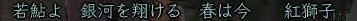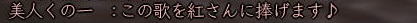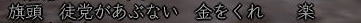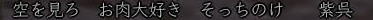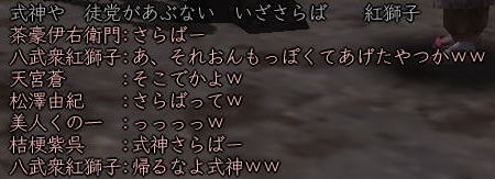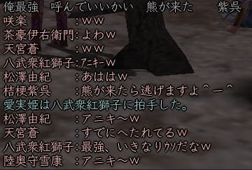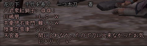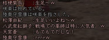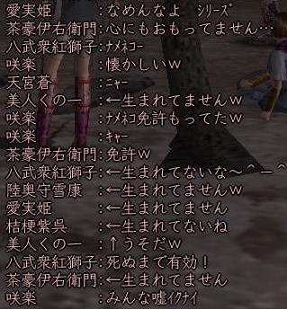 ![]() 魂の横滑りレースも一段落ついた頃、 「ただいま〜^^」 と戻ってきた姫。 ![]() 「では、いよいよ歌会本番といきますか!」 と、スックと立ち上がった蒼ニンジャー。 ![]() そりゃ、そうなりますよ。 ( ̄▽ ̄) ニヤ 世の中 言いだしっぺが 先陣を切るものです! ![]() さぁ、歌会の幕開けとなった 最初の歌は 一体・・・ ワクワクo(^^o)(o^^)oワクワク 予想をはるかに上回る ほのぼのぶりに、 一同、一瞬息を飲みます。 そして、その後 かわい〜!!! と絶賛の嵐。 ![]() ここでむっつんから一つの提案が。 おぉ! それは いい案だ!!! そんなわけで、今後の歌は このルールにのっとって動作するのだー! さて次は、 蒼くんもお気に入りのこんな歌♪ ![]() ![]() ブラーボー!! ![]() 蒼くんの渋い歌に みんなのボルテージもあがりますw さて・・・・ 次に飛び出したのは こんな歌。 で、田楽職人 腕広げ・・・・・ ![]() (協力:某忍者さまの男侍変身姿) 紅の妄想大爆発! (*ノノ ![]() 続いてはこんな歌。 ![]() これをきいて スックと立ち上がり、 チラリと足をみせるサクラ(神通薬師) そして、放ったセリフは、 ![]() 誰かみてあげてください;; ![]() 気づけば なにやら 桜が夕陽に染まり、 ノスタルジックな 蒼くん屋敷。 そんなとき、 みんなが 驚いたこんな歌が飛び出したのです! これに対して、 初心者松澤さんの貴重なツッコミ。 Σ(== !! ![]() んで、話しは いつものごとく飛躍しまくり、 ![]() ここに、ホモ3兄弟が誕生!! フォー!!! ・・・・と、風情満開の歌会は、 いつの間にか、ホモハァハァになり、 いつの間にか、紅子は「二の腕ぼうぼう」 とか呼ばれてましたからー! 生足ハァハァのほうが ましじゃないか、テヤンディw ![]() さて、二番手は紅子。 みんなを前にすると、ちと緊張するのね。w 綺麗でしょ、ねぇ綺麗でしょ!?;; あるでしょ、ねぇ こういう時ってあるでしょ!?;; でもね、みんなのノリ的に、 この時の紅子は何を歌っても ![]() ってコメントばかりでしたがな! 誰だ ぼうぼうゆったの!(#゚Д゚) ww ぼうぼう紅子は、 めでたく、#ずっこける をたくさんいただきまして、 次に舞台に立ったのは、 ![]() へそ先生。 A4(=アフォ)徒党の中では 唯一知力っぽい存在のへそ先生。 知行のときも、誰よりもはやく情報をゲッツして いろいろみんなに教えてくれました。 魔犬のときも、 いろんな作戦を考えてくれて まさに、策士:へそ! まぁ、アフォはアフォなんですけどね。。。 そんな クールなへそ先生の歌とは一体! へ、へそ先生〜!! 思わず コーヒー噴いた紅子です^−^;; 続いて、どっかの博覧会のテーマみたいな こんな歌。 そんでもって、 次は、「召喚おんも」へそ先生に 捧げた紅子作の歌。 ![]() えっと、 へそ先生のペット「へそ」が どんなやつか垣間見れる 貴重な一首ですね^^ 続いて、再びホモ疑惑のこんな歌。 ![]() さて、ワクワクの4番手は、 生足ハァハァお花です。 ![]() ちびっこお花のイメージで、 陽気でわんぱく、元気でかわいい。 そんなお花の 裏側を見ちゃったようなこんな歌。 ![]() お、お花・・・・( ̄□ ̄;)!! いつも旗を任せているだけに 妙にリアリティのあるこの歌、 かなり笑えました。w きみは、お金で動くのかー!ww そして 5番手は TD終わってかけつけてくれた くの一さん。 テンキュル♪ ![]() おぉう! なにやら捧げられたぞ! 討ち死に上等 ><b 極んで、極んで、極んで ・・・・・んで、 ぶちかましできたら サイコーね♪ ( ̄▽ ̄) ニヤ この歌をきっかけに この後、M談義が始まったのは 言うまでもないです。 ![]() そんな時、6番手で手を挙げた 幼馴染、ちゃごちゃんのこの一句。 すかさず お花から 「ネタ忍ー!」 と野次が飛びます。 そして、この「なめんなよ」から、 話しは意外な展開に・・・ ![]() みんな、嘘イクナイ ^−^ ![]() そして、最後のトリを勤めましたのは、 我らが 姫ー (いろんな意味で)甲府一と名高い 姫の歌で締めくくりましょう〜♪ さぁー。 張り切っていってみよ〜! ![]() ぐわー!! そんな 般若姫が詠んだ歌はこんな歌でした。。。 その姿で言うと、 まじ怖いですからー! 。゜(゚´Д`゚)゜。 と、般若姫の歌を楽しんだところで、 歌会は終了〜♪ この後は、 お楽しみタイムが待っていたわけなのですが・・・・ 続きは おまけの絵日記で♪ (まだ 引っ張るのかよw) |