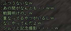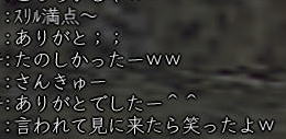 | お花たちに連れられて 初めて上野のコウモリ(山神の使い)にやってきました。 山神の使いのすぐ近くには、 あの「司夢理」というレベル60のとってもとっても こわ〜いおじさんが待ち構えているのです。 ![]() こんなおじさんですね。 グラ的には、見たことあるような気がするのは 内緒ということで・・・・ とにかくシムリに絡まれた人は レベル50の侍さんでも 一撃で死んじゃったという目撃談があるくらい まぁ、助かる見込みはないわけですね。 そんな時、もげ神主が言いました。 ![]() 「今すごく、シムリを寝かせたい衝動にかられています。」 @@!! 失敗したら大惨事! 成功したらオイシイ写真! どうなるあたしたち(の、所持金50貫) 「ピィィィ〜〜〜〜〜〜♪」 もげの笛の音が、山の中にこだまします。 ・・・と、次の瞬間。 ![]() 寝た!! シムリが寝たよ! 急げぇ〜〜!!! ・・・・・・・・・・ところがその時・・・・www 襲われたのは誰とは言いません、 ヒントはこんな感じ。ww ![]() ![]() いやぁぁあwww まじ腹痛かったわぁwww コウモリ狩り終わったら、 シムリ絶対起きてるはずぅ〜〜www どうする、どうなる あたしたち! ・・・・で、間もなくコウモリとの戦闘が終わり・・・ ![]() ・・・・・・・・・・・・ ![]() ・・・・・・・・・・・・ どうしますか、この状況www あ〜 この時の無言の間がなんとも言えずおもしろかったぁwww ・・・・とそんな時、 こんな危機的状況を救ってくれた 一人の勇敢な薬師さま!! ![]() どうやら、もげがこのおもしろい状況を 対話で知人の薬師さまに実況していたらしく、 「それはオモロ!見学に行こう!」 と、ノリノリで見に来た薬師さまだったようです。 ・・・・で、来て見たら まさに 無敵状態で立ちすくんでいるあたしたち・・・ 彼はとっさにシムリに飛びこんで 自らを犠牲にしてあたしたちを逃がしてくれた英雄でありましたww 2撃で逝ってしまったという 薬師さまを転生で呼び戻し、ひとしきりお礼をいうあたしたち。 ![]() ![]() ![]() そんなわけで、薬師さまが別キャラの侍さまに代わって 再度コウモリ狩りをしたあとの 仕切り直しの記念撮影となったのでした♪ |