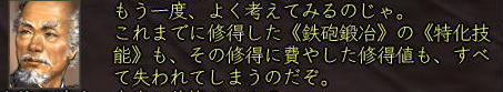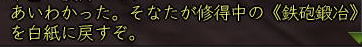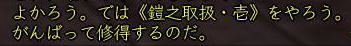 もぉぉぉぉぉ〜〜〜!! 緊張してんだから じらさないでよぉぉぉぉ〜〜>< o(>_< *)(* >_<)o ジタバタ おじいちゃんのじらし大作戦に 紅子の決意は ほんのちょっとだけグラついた。 ・・・・思えば乱射乱撃まで修得あと少しだったなぁ・・・ 鉄砲鍛冶として活躍したことなんかあったかしら・・ 一度だけ、徳川復興戦で NPCに襲われた方の所に援護で入って 破鎧を打ったら 意外にも結構なダメを食らわせられて、 「かっこいいーーー^^」 と、年下の鍛冶屋の女の子に言われたことがあるだけ。 ![]() ああ、・・・・今思えば それが紅子の鉄砲鍛冶の華の時だったのね・・・・ しみじみ。 ![]() 「かっこいいー^^」 ・・・・・嬉しかったなぁ〜・・・・ しみじみ。 鉄砲鍛冶になった時に 朱雀からもらった連銃、 記念にとっておきますよ。。。 ![]() 紅はこれから鎧鍛冶になります。 陽動や罵詈雑言でバンバン敵を惹きつける 立派な鎧鍛冶になります。 これが紅の決めた道。 わっほ〜い♪ もらった、もらったよぉ〜! 帰り道、山賊町の茶屋親父に声かけてみると ![]() ![]() ・・・・山賊町の茶屋おやじ、 ダンディじゃなかった・・・・・・www ところで後日談。 目録もらった日に早速使おうとしたら 条件満たしてないって・・・ ⊂(_ _⊂ ドテッ 兜4の修得、 「ど〜せ 唐人兜なんか作んないよぉ〜 へへ〜んっw」 って、気持ちであとヒトマス残してたの すっかり忘れてた^^;;;; ああ、これほど自分を恨んだことはなかったです・・・・ ![]() そんなわけで、 生産にこもってさっさと兜4を皆伝し、 鎧之取扱・壱を使ってみた。 ![]() これで晴れて鎧鍛冶への道が開けたわけで・・・ ![]() よっ・・・・・ ![]() しゃぁぁぁぁぁ・・・・・・ ![]() あぁぁぁぁっぁぁっぁぁぁ・・・・ ![]() これからどんどん殴られるぞぉぉぉ〜〜!! やっぱり紅はMかもしれない・・・・・・ |