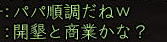 ![]() ちゃら〜ん 八武衆紅獅子ですw さてっと、知行はどうなってるかな〜 えええーーー( ̄□ ̄;) ![]() ああ・・・すでにもう目も当てられない(/ω\)・・・・・・ 野武士に殺されたのかぁぁぁ〜!!?? ちなみにこれが前回みた人口と石高・・・ 徐々に減っています・・・・ 悲しいなー。 わけのわからないままケンゴを買い物に行かせてたけど、 狸から「ケンゴ要注意!横領の恐れあり!」との情報を得て 買い物から戻す。 そして、別なお仕事で「治水」を任せてみた結果が これです^^;;; ちなみに、施設作ってる昌子はもっと最低。 「6」って・・・!! 「なんであたしが林地造んなきゃないんだよぉ!」 とか思ってんだろうな〜(−−;; でも、施設造ってるの途中でやめちゃうと最初からやり直しっていうから・・ 昌子にはなんとか頑張ってもらわないと・・・ で、これは、前回の会話から・・ ![]() 村娘の所には農学者が来たらしい。 これはよい方のイベントで、 悪い方のイベントが野武士襲来や、台風直撃などなど。 あたしには・・・・台風来るわ、野武士くるわ。 悪いほうのイベントばかりが来てるのね(−−; ちなみにへそ先生のところでは、今日お祭りがあったそうですw あぁ、農学者こないかなー! そんなことを考えていると、 パパ忍からこの発言。 ( ̄□ ̄;)!!まじで!! ![]() もう一度、これがあたしの森林の現状・・・・ なんだっ この差は!! パパのアドバイス、そのままいただき! ところで・・・・ 今日筋兜に立物つけました。 部隊アイテムでもらったもので、 今日まで大事に大事にとってきたもの。 今年最後の思い出にと、ついにつけちゃいました! で、それがコレ ![]() 「東京タワー」とつっこまれるゆえんがわかりますでしょ? (つд∩) ウエーン さて・・パパのアドバイスをもらって、 紅の考えた作成。 ・昌子は施設造ってるからそのまま。 ・ケンゴは治水してるけど、速攻中止→開墾に (忠誠度回復なんてもう知らないw) そして、今日見つけたスーパースター! ![]() アイちゃん! でました、星9つです〜!! しかも、☆じゃなくて、★だし^^ 知力もちゃんとあるし・・w アイちゃんの魅力で勝負!というわけで ・アイちゃんに商業おまかせw 紅は、村役3人も抱える領主になってしまっただー。 お給料払えるのかな・・不安もあるが^^;; 「年末年始ログインしないなら、知行にお金振り込んどきなよ^^」 と、へそ先生にアドバイスもらい、 付与石買いまくってすっかり淋しくなった 紅のお財布から、なけなしの20貫を投入。 ケンゴとアイちゃんに10貫ずつ投資しました。 これで、彼らも無事にお正月を迎えられることでしょう^^v |