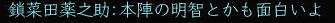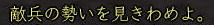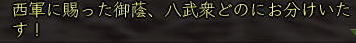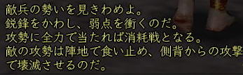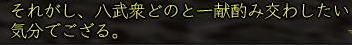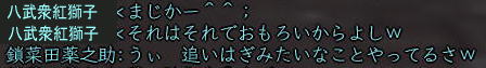 ![]() ちゃらんこー♪ 八武衆紅獅子(陣笠) もしくは刈り上げ・・・ でぃっす!!! 1年ぶりに東西戦がパワーアップして帰ってきましたねぇ。 今回は、人数差を解消すべく、 ランダムに東・西に振り分けられる仕様。 これだと、普段組むことのできない 他国の人とも組めたりして はたまた湯〜名人をコッソリのぞけたりして 楽しいこと 楽しいこと♪ 逆を言えば、 同じ武田さんとも戦えるという あまり楽しくない仕様だったりもしますが (;つД`) 不在徒党とは やりたくねぇ〜ww ![]() まぁ、とにかく、 まずは、アレだ! 門近くにいる このおっさんに話しかけるのだ! 徒党を組んでいれば みんなで入れるし、 合戦場で待ち合わせなら 行きたい陣に当たるまで 「いいえ」を繰り返していればいいw (一度入ってから戦場を出ると 30分たたないと再入場できない というので要注意!) で、「薬」「道具」の類を持っていると 受け付けてくれないこの現状。 とにかく、アイテムを「使える」ものは みんなダメみたいね。 立物も調理道具もダメみたいよー (つд⊂) 倉庫、パンパンでし・・・・ しかも、入ってから装備品一式が至急されるので 袋も9個空きがないとダメという・・・ このへん なんとかなりませんか? コーエーさま ^−^メ 材料やらで倉庫がやたらパンパンの 紅子はこの時点でもうヒィヒィ・・・ ![]() そのへんをなんとかクリアすると、 ほい、さんじーん!!! レベル50の紅子は、大津にポイっとな〜 (ノ・∀・)ノ ![]() ソロで入ってみると、 おぉぅ、新ちゃんの薬師、 薬ちゃんがいるじゃないかw 実は今日の紅子は、 ちょっと装備品で遊んでみたくて ちょこっとログしただけw ![]() 早速軍艦から装備品一式を受け取ります。 ![]() 頭〜お守りまで 9品受け取ります。 それぞれに付与をいれられるので 夢の耐久+50なんかも 軽くやれちゃったりして にわか 鬼装備にご満悦♪ ![]() 銅装備は、当然銅丸(はっぴ)ですよ!! ちなみに どの装備でもたいした差はないようなので、 先日は 玉薬師が ちきりに耐久50ふって遊んでましたw 頭は陣笠、武器は槍・・ えっと、耐久、生命のバランスはどうしようかな〜 なんて、軍艦のおっちゃんと話すことしばし。 ![]() 軍艦に ナンパされました (*ノノ) うるせー、あたしと飲むなんて 10年はぇぇよ! と、軍艦を一蹴しつつも、 ![]() 元気玉(強靭丹のようなもの)だけは しっかりいただいく、ジャイアンな紅子。 そんで、遊びで作ったこのオシャレ装備・・・ ![]() この帽子の目深さ、 サンチョを彷彿させます。 ちょっとニヒルな紅子に そりゃ もう 拍手喝采 差! ![]() 防御600も超えますた! でも、薬ちゃんに確認すると、 みんな500は普通に超えるみたいね〜^^;;; 時間もないし、 1戦だけソロってみようかな〜 なんて考えてたら 薬ちゃんから 「7人でソロ狙いの徒党がいるから注意!」との対話をいただく・・・ ![]() あい、気をつけます!! ![]() おぉっと、 門を抜けたら いきなり前線かいっw ![]() 橋の向こうには、ソロ侍さまらしき人も見えます。 ![]() こっちには、ソロ忍さまが。 ![]() ![]() いったん 陣へ引け〜!!! (゚Д゚;∬アワワ・・・ ソロはやったことない 腰抜けな陣笠(紅子)⊂(_ _⊂ ・・・・って、陣に入ると・・・・ ![]() は、半兵衛!!!@@!!! 準備なし術に、 弱体させても 多くの知人が泣きを見たという 噂の半兵衛が 今ここに!! ![]() そして、ちょっと かっこいい。 (*ノノ)キャ ![]() ラジャ!( ̄- ̄)ゞ 半兵衛さまのおっしゃる通り! 興奮して薬ちゃんに対話を送る紅子。 すると、薬ちゃんから こんな お返事が・・・ ほほぉ! おもしろいと聞いたら 行かないわけには イカーン! 走れ!本陣!!! と、半兵衛陣を出て駆け出すこと 数歩・・・ ![]() なにこれ、停電 ^−^? ![]() ・・・・・じゃ、ないみたい^−^;;;; 紅子の頭には、 先ほどの薬ちゃんの言葉がリフレイン・・・ 追いはぎ、 キタ━━━━(゚∀゚)━━━━!!!! ![]() おちつけ、 おちつくのよ、紅子!! 今日のあたしは 陣笠よ!(意味不)。 ![]() 半兵衛さまに教わったことを胸に・・・ 勢いね・・・勢い・・・・ ![]() 後光意味ないよ〜! ![]() 気合もそんなに いらないよ〜! ![]() 混沌も 多分 意味ないよ〜! ![]() だって、ソロ紅子にできるのは 逃亡だけですものっ (´Д⊂グスン この構え、まさに 雑魚兵・・・・ そうよ、今の紅子が痛いのは・・・ ![]() コレとか・・・・ ![]() ソレ!! ![]() 隊長っ!! かわせません!!! (つД`) ![]() 向こうの 薬師さん、 /●・∀・) か〜わ〜い〜い〜 ![]() まぁ、陣笠(紅子)も負けてないけどねっ ツーンw なんてことを ボーっと考えているうちに ![]() オネムになっちゃったわけで。 ん〜。ただこうしてるのも 芸がないな〜・・・・ と、いうわけで、 ![]() 正座してみた。 あ、武芸さま 今週お誕生日なんだ、 おめでとうw さて、甲府のお墓に戻った紅子。 せっかくなので、 ![]() 門衛ゴッコやってみた♪ あ、門衛・・・・陣笠・・・・・ww ![]() で、これが門衛の主観ね。 ・・・って きょろぺーが帰ってきたわ、 おかおか〜^^ その格好は採集かい?^^ お疲れ