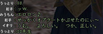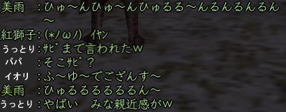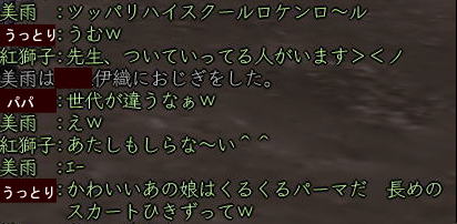 ![]() コンピラポポロッチ♪ 紅子です。w なぜちょっと 「楽しむ」チックな動きをしているかというと、・・・ 今日は、ちょっとしたコラボレーション。w いつも掲示板に登場してくれる みうちんと、イオリちゃんと一緒に 狩りに行ってきちゃいました。w ![]() ![]() みうちん(左) イオリ(右) で、まずは集合写真を一枚♪ ・・・・って、 ![]() キミタチは女子高生ですか〜!笑 ![]() ・・・というわけで、今日は 紅子含む甲府一の美人さん(自称)たちと遊んだ日記です。w ちなみに 紅46歳、みうちん37歳、イオリ29歳です。 あたしたち、年代別リレーに出れちゃいますから〜〜〜!!!ww ![]() お手伝いしてくれたのは、 クールな暗殺ニンジャーパパと、 ![]() 必殺救護が徒党を守る、 我らのお医者さん、うっとり薬師。 ・・・で、この5人でどこにいきますかねぇ? というわけで、 ひとまず武蔵に。 武蔵といえば、針毛犬。 針毛犬といえば、武蔵というくらい 針毛満載の武蔵丸。(紅的には) ![]() そんなわけで最初の敵は針犬君に決定さw でも、徒党もいたし、なんだか呆気なく勝ててしまったので すこ〜しずつスリルを高めていくことに・・・ 鬼熊〜すねかじり〜・・・果ては屋敷の門衛まで〜・・・ それでもちょっと物足りなくてぇ〜・・・ もう、国超えちゃいます! 「カワソはどう?越中だけど・・・」 「どこへでも〜^^」 というわけで、一路富山へ向かってレッツゴー♪ ・・・・そして立ち寄った富山にて。 ![]() ![]() 突然、みうちん主催飲み会が勃発! ![]() そしてうっとりが、まさにうっとり状態になったのか、 とうとうマイクを手にしてしまったのです。 ![]() ![]() めっちゃノリノリな人が二人ほどいるんですが♪ そして世代が違うなぁ〜なんて言ってるパパ、 ものすごい同世代でしたからぁ! ![]() この頃、マスクが加わるも、 ![]() 歌は鳴り止まず、北風小僧の○太郎に突入。 そこには、一種の連帯感のようなものまで生まれつつあったのです・・・。 ちなみに、このあとはコンピューターお○あちゃんになりました(笑 ![]() あ、そうそう カワソだったねw ・・・マスクの細かいつっこみ 大好きです!www ![]() そして待ちくたびれたカワソが ダッシュで飛びかかってくるも、 ![]() イオリの前に向かうところ敵なし。 イオリ、29歳。 ![]() 気合待ち中に、将棋を始める粋な女の子w ![]() ![]() 何故か エロ先生呼ばわりされているおちゃめな女の子ですw あ、そうそう、それでカワソねw ![]() なんか、ウシロで始まってるみたいですが・・・ww ![]() ま、このへんは ヌンジャーにお任せしてっと・・・ 夕焼けシルエットで、もうパパかマスクか判別不可能ww ![]() ♪さて、改めて 戦闘後に記念撮影♪ いやぁ、レベルはさまざまだったけど、 結構高レベルの敵でもいけちゃうもんですね^^ 楽しかったわぁ〜 そんで、今日の紅的お気に入り大賞は みうちんのこの一言www トイレっていえよ、トイレって(〃^∇^)o_彡☆あははははっ ごめん、こういう 関根勤チックな一言、ツボなんです、結構・・・・www ![]() 楽しかったわぁ^^ また遊ぼうねぇ〜〜〜^^ノ 何度も手を振りつつ、みうちんとイオリちゃんにお別れしたのでした。w |