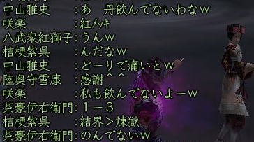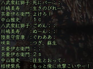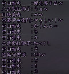 ![]() こんぴらぽぽっち! 紅子だす。 メリークリスマス ひゃっほい! 似合わないとは いわせない。 さて、 今日も平和な甲府の町。 はい! 私設会話は「タン麺」です!! ワケワカンネーw ![]() 平和ないつものご挨拶。 うん、ベニコは合戦で 疲労100のまま落ちてたのですね^^; プチ怪我状態コイ!щ(゚▽゚щ) そんな平和な タン麺徒党ですけど、 今日は最初から目的がありました。 そう、マキャンです。 一会徒党にこだわり続け 今まで負けた数 数えきれず (ノ_-。) でも、今日は「勝つこと」に固執してみました。 と いうのも、今日をもって 村娘が休養に入るのです・・・・(;−;) 村娘に、区切りよいラストにしてあげたい! みんなの心は一つなのさ。 んで、走りながら 構成を確認、確認。 ![]() 皆様、誤字にはくれぐれも 注意しましょう ^−^ で、半分ベニコのわがままで 今回もまずは 一会徒党でチャレンジすることに。 だって だってなんだもん♪(はぁとw ![]() さて、黄泉にとうちゃーくw とっとと走ろうとしたベニコに ![]() ![]() ゴンちー ス・テ・キ! きっと 生きてマキャンに会おうね〜! ・ ・ ・ ![]() ・・・・・・・うん。 ヨクヤッタ! カンドーシタ! ![]() そんなこんなしてるうちに みんなが集合。 今日こそ この壁、突破しようじぇ! と、固くココロに誓ったタン麺徒党。 ちなみに この構図を見て、 「背中に夕陽しょったら Gメンだね」 といったのは 他でもない 村娘です。 あんた いくつじゃ!w この頃ハルキ君から マケンがんばれと対話きてたんですが 興奮してるハルキ君には申し訳ないんですけど・・・・・ ![]() ごめん、カップやきそばのこと話してた(*ノノ その後も 吉幾三歌ったり、 顔文字作ったりして遊ぶ 我らがタン麺徒党。 ・・・・先行徒党さま勝っちゃったから 暇だったんですYO!!!w そんな 湧き待ちの間に、 むっつんがリアルでシャワーに行き、 戻ってきたころに ちょっとした事件が起きますた。 うん、編み髪のバァちゃんに絡まれたw (アルアルアル!) ![]() まー、ここまではよくある風景なんでしょうけど・・・ ![]() リアル裸で のぶおんするむっつん。 珍しいことです・・・・・ その後、 お花と2人で ゴンちゃんの頭を ![]() ポンポン。 ![]() ポンポン。 と、叩いて(ヅラだから)、 ![]() 見えない壁を 突破した気分を味わいましたw ![]() さて、そんなことしてるうちに マキャンが湧いた〜 やっちゃる やっちゃる やっちゃるぞ〜!!! ハァハァハァハァハァ ![]() 小手調べしてるのは こっちだぜ、ベイベー!! ![]() なーんて 思ってたんですけどね。 ![]() バンってきて ![]() ![]() バタン。 あはは。(乾) たった一枚の鍛冶屋死んだら どーやって勝つんだよ ^−^; あたしの バカバカバカ! ・・・・と、思いきや ここからが タン麺徒党の腕の見せ所! ![]() まずは、お茶ニンジャーの援護。 そして、 ![]() 村娘僧の往生が通り、 (注:ベニコ蘇生もらってます) ![]() 生き返ったむっつんが ![]() 援護 ![]() 援護! ![]() 援護!! ![]() なんと、4連続!!! ![]() ステキ神主(ノーパン疑惑中)復活! よくやった! 感動した! 全米が泣いた! ![]() うん、結局勝てなかったけど・・・ 全滅したって悔いはないのです!! 力の限り頑張った!! 次の戦闘待ちしてた 薬師さま、転生サンクスです^^ さて、作戦2いってみよ〜! |