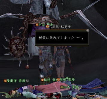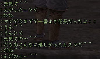 ![]() みなさま おはこんばんちわです。 怒涛のマキャンを終え、 初めての場所にたどり着いた紅子。 ここね、うん、 ![]() こんなオサーンがいるのです。 しかも、周りには ![]() 美女3人のみ。 ヤローども、どうしたぁぁぁ〜!! と、いうわけで ここまでのいきさつを振り返ってみませう。 それは、ほんの数分前のことでした。 ![]() 無事にマキャンを撃破したタン麺チックなあたしたち。 かなりの深夜に食い込んでいましたが、 バリアを超えた嬉しさと 析への好奇心が 疲れを跳ね飛ばしてしまうのです。 ![]() 当然、強行準備(はぁとw この中で析まで行ったことがあるのは ゴンちゃんだけ。 知らない道、 知らない敵、 ダンジョン、 強行ダッシュ ・・・・・・これだけ条件が整えば ベニコが死なないわけがない。 と、思いきや。 ![]() なんと、生還しちゃったw でへへ。 ※ログが残ってないけど、むっつんもしぼー・・・・のハズ! (生きてたら笑ってユルセw) まぁ、ヤロウ君たちが 体をはって女の子を守ってくれた ・・・・・と、いうことにしよう。 (ヤサシイナァw) で、みんなが析前に揃ったときの カンサイの第一声。 キテレツ斉さまの発明ナリカー!? ま、そんなわけで みんなでパシャっと♪ ![]() ![]() だって 観光客だもん。 さーて、写真も撮ったことだし めでたく析で死に戻り〜とするかぁ〜 ・・・と、思いきや。 みんな装備して本気実装で戦うとかいうじゃないですか。 おいおい、何時だと思ってるんだい、ベイビィー マキャンを破ったテンションが ここまで気持ちを高揚させるのかっ!? で、 本気実装・本気装備 (丹なし、怪我人若干4名)の状態で ![]() まさに A4(=アフォ)徒党♪ 析雷に突撃しまっす!!! ("`д´)ゞ ラジャ!! ![]() ドキドキしつつ、析に話しかけるベニコ・・・ って、 ![]() こっち向け、カンサイ!!www ![]() そんな こんなで 戦闘開始っ! んで、これガンダムネタなの?(’’ ![]() 析の感想。 ![]() 痛くなーい。 煙いだけ? リアクションでかーい。 手裏剣当たっただけで ウォォってのけぞる姿がイケテマスw ![]() 難攻不落が出る分、 ちょっと楽。 実は・・・ 一番ハァハァする瞬間なんです。 難攻不落(*ノノ 盾ハァハァ! 難攻不落ハァハァ! 自画自賛!! そんなわけで 意外にも粘れちゃってる あたしたち。 ![]() (どうしよう、勝つかもしれない) 一抹の不安がよぎったそんな時。 ![]() めでたく全滅。 ☆-(ノ゚Д゚)八(゚Д゚ )ノイエーイ ![]() 気がつきゃ、黄泉の検索結果7人だけになってますた。 ![]() ![]() 廃となったことに 嬉しそうな幽霊の人たち。 ![]() で、場所は変わって 小谷のお墓。 これから、 本日のフィナーレイベント。 こっそり花火があげられます。 へそ先生が、この日のために とっておいてくれた スペシャル花火だじぇw ![]() ![]() ![]() ![]() へそ先生、打ち上げサンクス! 見えなかった分、SS画像で楽しんでくれ〜 ![]() 日が昇り、 花火が尽きて 小谷のお墓でたむろするあたしたち。 ![]() 村娘とのしばしのお別れを 名残惜しみます。 と、そんな時。 ![]() 多呂介に邪魔されたっwwwww ごめん むっつん。 これ、妙にウケタwwwww さーて。 廃人たちも いよいよ帰るときがきました。w ![]() 両替に戻るみんなを お墓で見送るベニコ。 この日ばかりは 一番落ちしたかったんだい。 疲れてたからじゃありません。 ![]() 例え、戻ってくるとわかっていても、 しばしのお別れを看取るのがイヤだったんだい。w ええ、ヘタレですとも。 (*ノノ ![]() ![]() みんなの声を聞きながら うん、忘れませんYO。 |